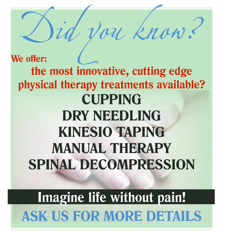 - Kinesio Taping, cold laser, and myofascial decompression cupping therapy, all of which increase blood flow to the injured and painful areas promoting healing.